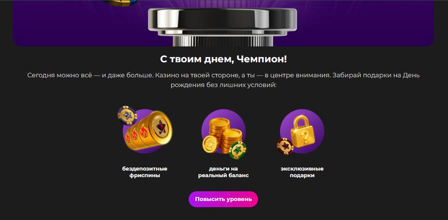 В казино Champion Slots игроки могут получать подарки в честь дня рождения. Их содержимое зависит от уровня лояльности. Чтобы получить подарок, аккаунт игрока должен соответствовать следующим требованиям: